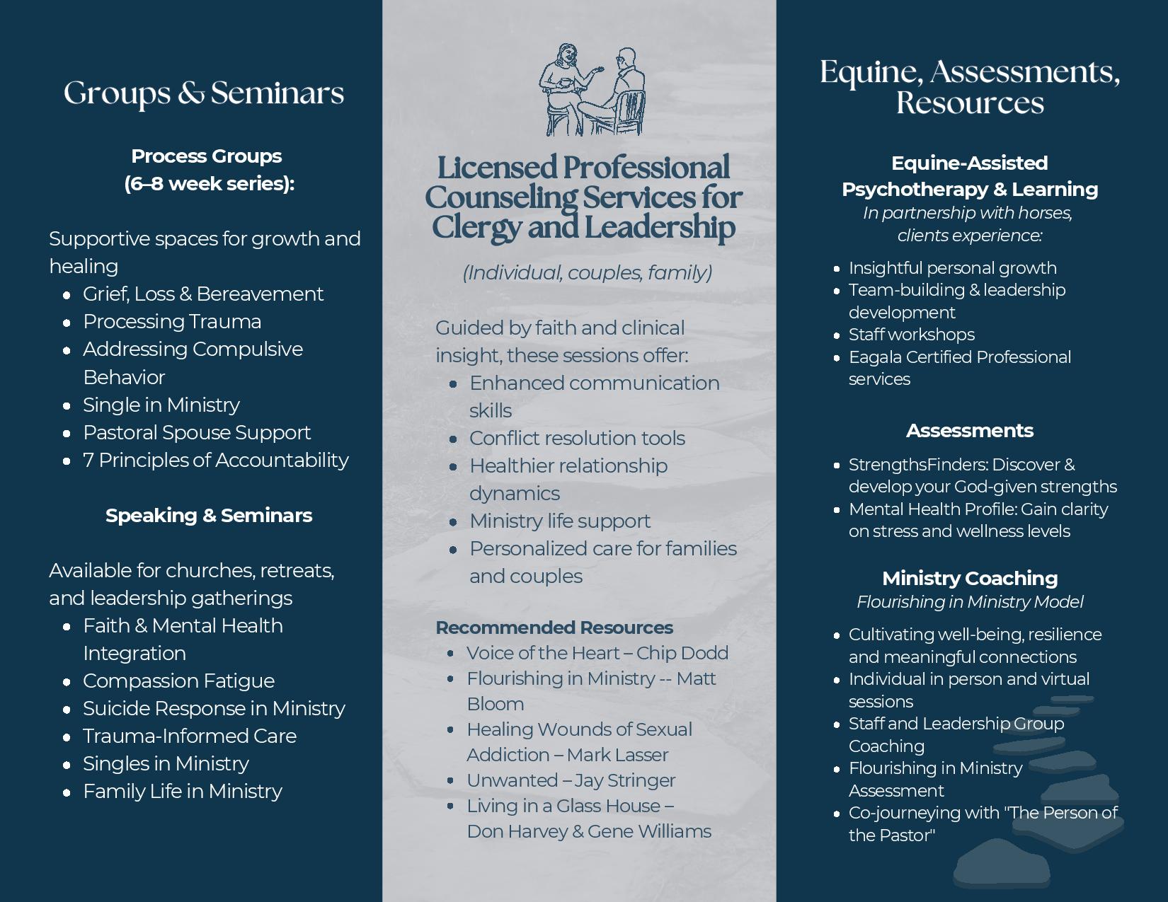We don’t want you to suffer alone, whether you are dealing with burnout, grief, conflict, or just needing help. To help you get started, the MidSouth District offers 3 free counseling sessions for Pastors and/or their families. The attached brochure contains Rick and Donna’s contact information to help you find strength for the path ahead